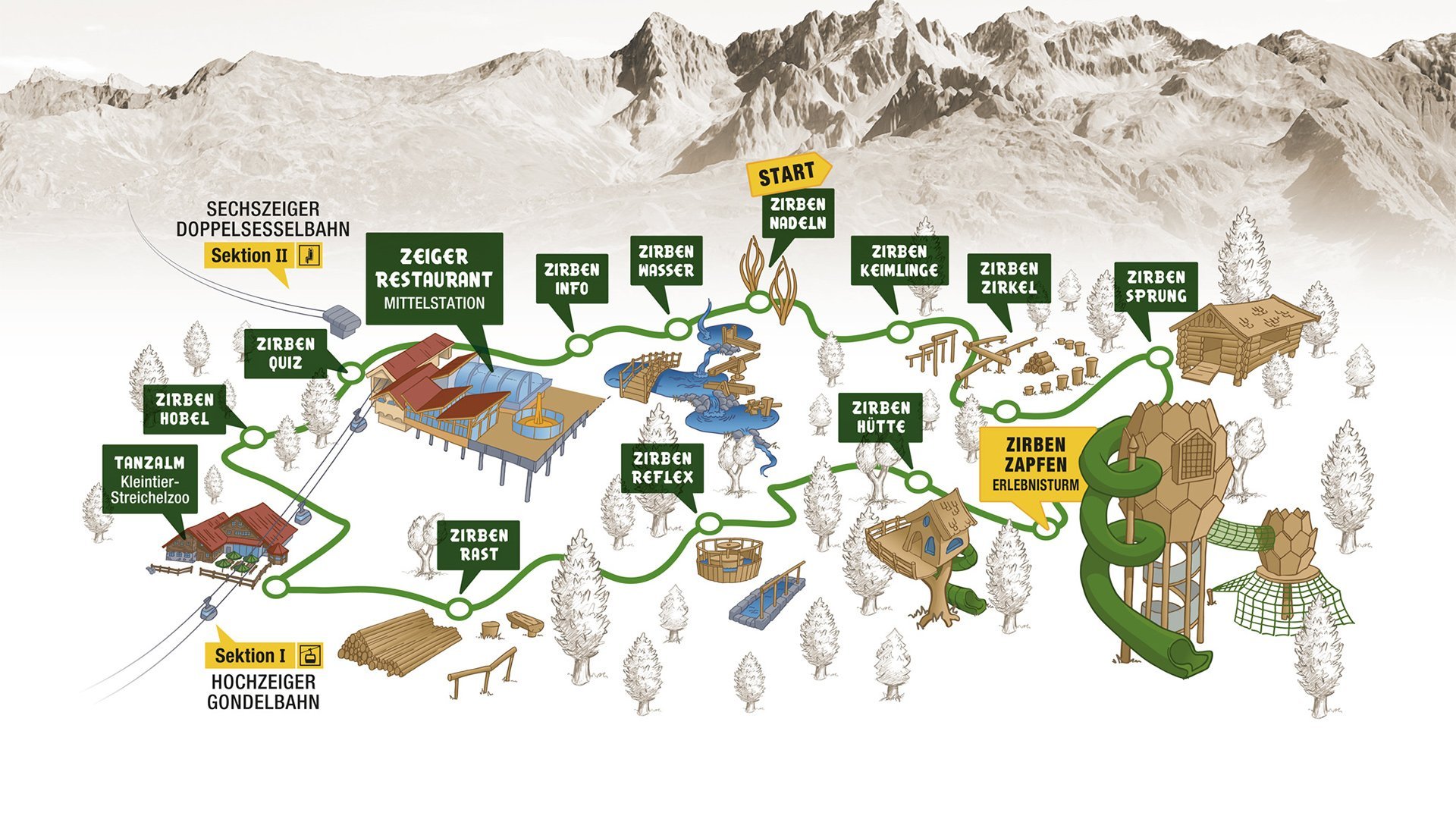 - Der ca. 1 km lange ZirbenPark-Erlebnisweg startet bei der Hochzeiger Mittelstation, verläuft in Richtung Zollberg und führt durch den Zirbenwald über die Tanzalm wieder retour zur Hochzeiger Mittelstation – Zeigerrestaurant. Im ZirbenPark lernen Sie in den unterschiedlichen Stationen die Zirbe kennen und das ZirbenErlebnis ist mit allen Sinnen spürbar.