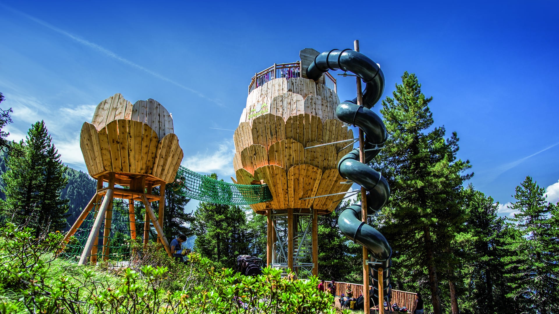 - Das Highlight des ZirbenParks ist der ZirbenZapfen-Erlebnisturm: Der 12 Meter hohe Erlebnisturm ist mit einer Aussichtsplattform und einer 16 Meter langen Röhrenrutsche ausgestattet. Zudem gibt es einen weiteren kleinen Zapfenturm zum Klettern und einen Netztunnel.