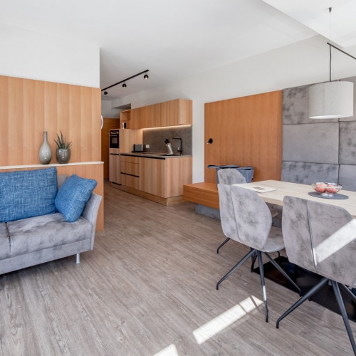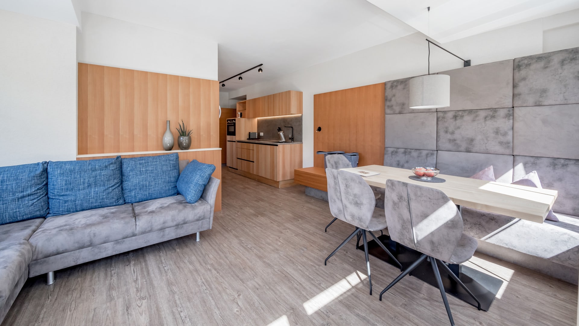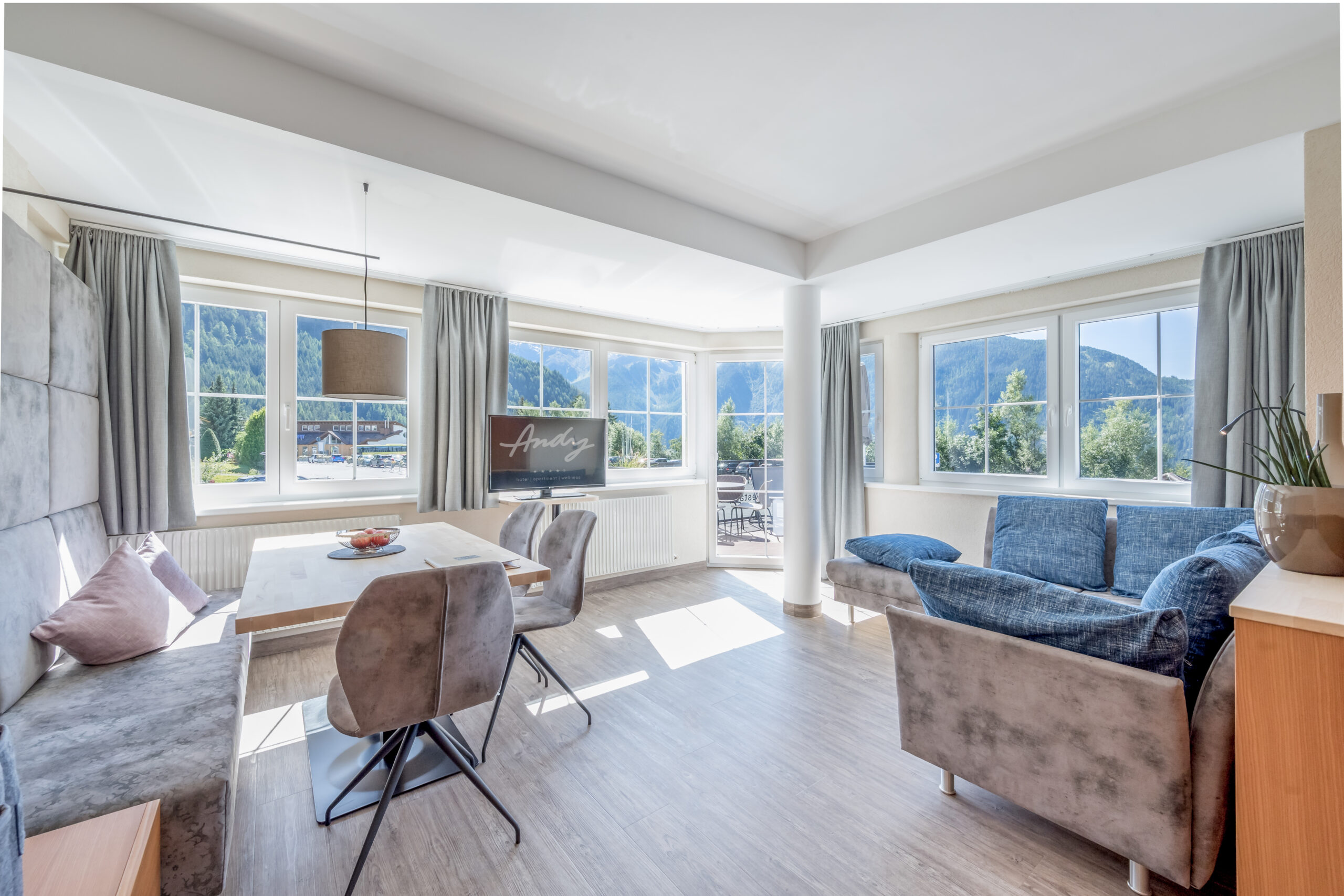 Wohlfühl Familien-Apartment für 2-4 Personen auf 1 oder 2 Etagen verteilt, voll ausgestattete Küche mit Kapsel-Kaffeemaschine, Essecke und gemütliche Sitzgelegenheit. Das Apartment ist mit zwei separaten Schlafbereichen mit einem Doppelbett, teilweise Stockbett oder Schlafsofa eingerichtet. Das Badezimmer ist mit Dusche und separatem WC ausgestattet. Zusätzlich bietet das Apartment Balkon, kostenlosen WLAN Zugang, 2-3 Flat-TV, Safe und Telefon.